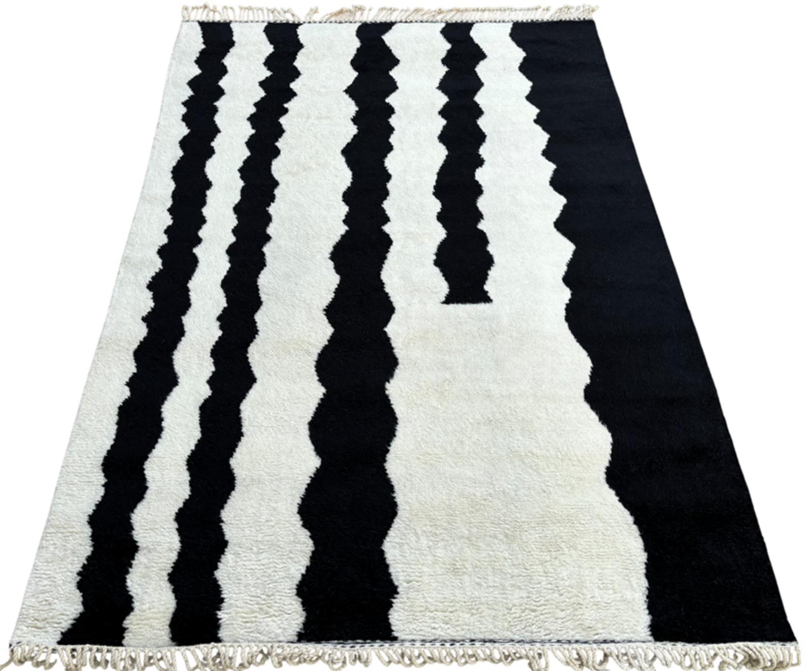 WOOLLEN WARP, WEFT & PILE. HAND-KNOTTED. SOFT PLUSH PILE IN WHITE WITH BLACK LINEAR WAVES THROUGHOUT.