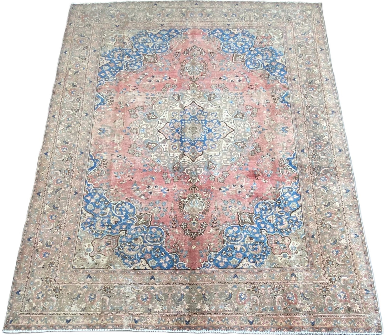 WOOL PILE. HAND-KNOTTED CITY WEAVE FROM THE NORTH-EASTERN KHORASAN PROVINCE WITH CLASSIC DESIGN OF A BOLD FLORAL MEDALLION & QUARTERED CORNER MEDALLIONS OVER-DYED IN PASTEL SHADES OF RED, PERSIAN & BABY BLUE & BROWN.