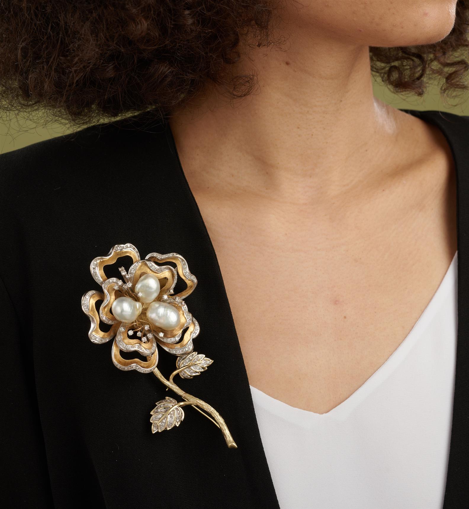 The brooch presents in very good condition overall. Pearls present with a good lustre, with some minor crazing to lustre (only visible with the aid of a loupe). All diamonds are secure in settings. Pin fittings are secure. Flower also has a bale fitting. Total weight 73gms.