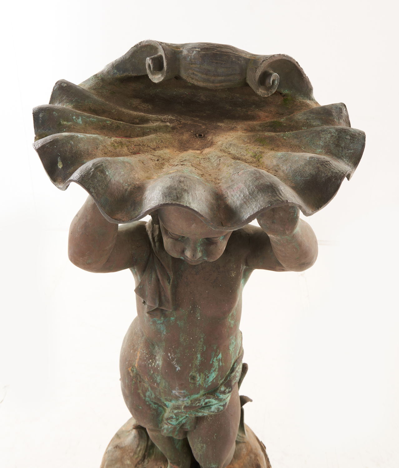 Modelled as a putto standing and raising a large shell, standing upon a concrete base