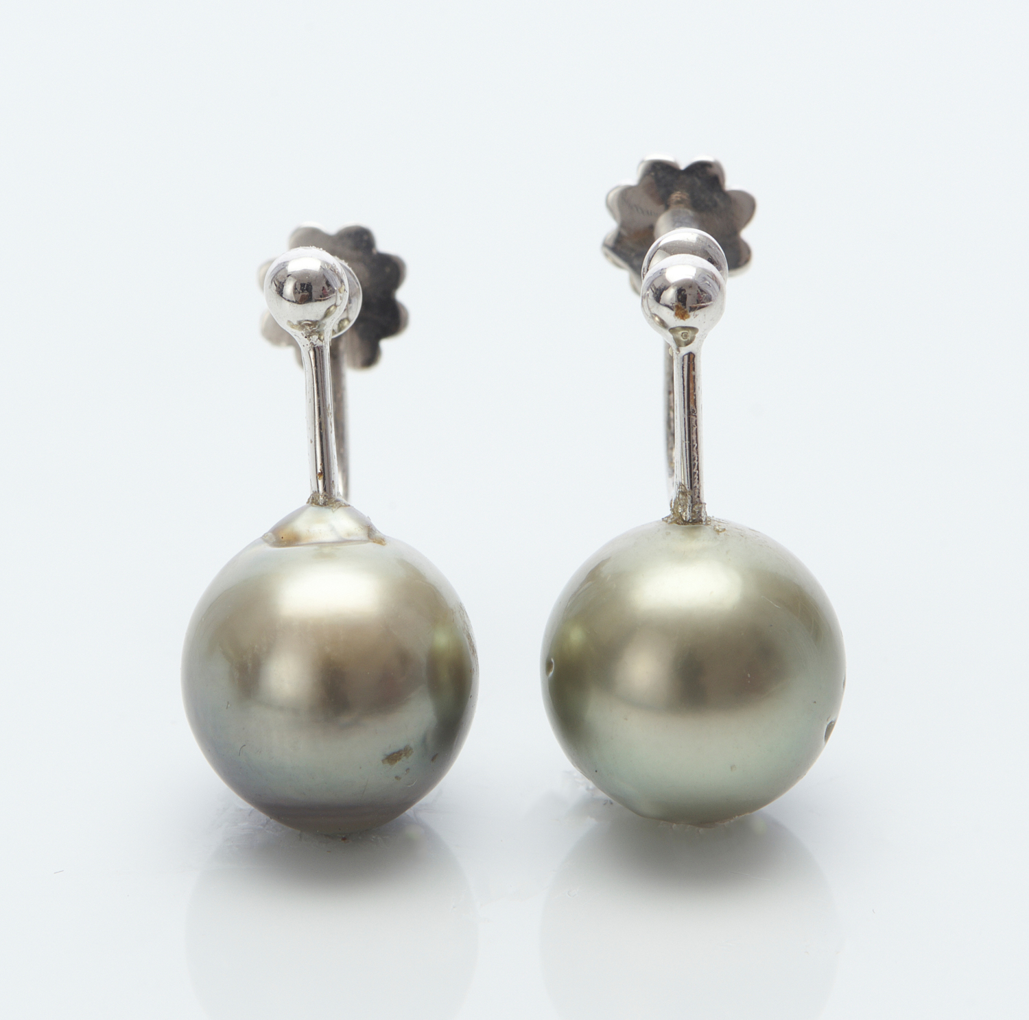 A PAIR OF TAHITIAN PEARL EARRINGS IN 9CT WHITE GOLD, EACH ROUND PEARL MEASURING 10.8MM, OF PISTACHIO GREY HUES, TO SCREW FITTINGS