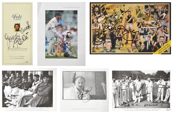 including an 'Australian Legends' poster signed in blue ink by Don Bradman; a black and white machine-print photograph signed in black felt pen by ten members of the 1948 Invincibles Australian cricket team including Don Bradman and Keith Miller; one with 7 signatures including Bradman; a copy of Time magazine signed on the front cover by Sachin Tendulkar; a copy of Bulletin magazine signed by Steve Waugh; two magazines signed by Shane Warne; a poster signed by Dawn Fraser; two magazines signed by Cathy Freeman and Ian Thorpe; and a booklet signed by Pele (a lot)