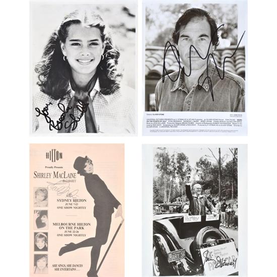 including seven 8 x 10 photographs signed by James Stewart, Micky Rooney, Douglas Fairbanks Jr., Oliver Stone, Debbie Reynolds, Brooke Shields and Olivia Newton John; a concert programme signed by Shirley MacLaine; and other subjects including Leslie Nielsen, Priscilla Presley and Drew Barrymore (a lot)