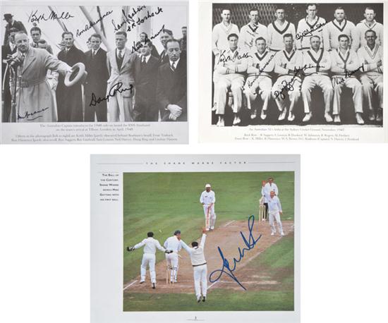 including two black and white machine-print photographs signed in black felt pen by seven members of the 1948 Invincibles Australian cricket team including Don Bradman and Keith Miller; a postcard signed by Jack Dyer; a machine-print photograph signed by Tony Lockett; a copy of Bulletin magazine signed by Shane Warne; a machine-print photograph signed by Thorpe; and two machine-print photographs signed by Allan Border and Dennis Lillee (a lot)