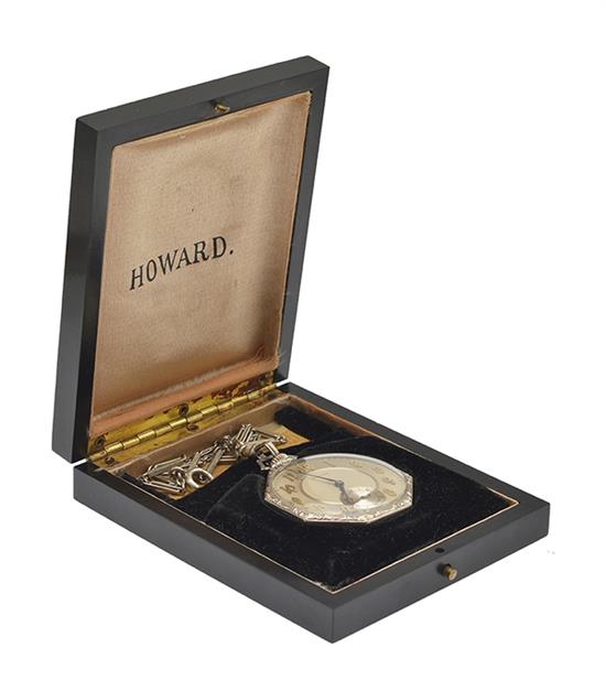 Crown wind and set movement, circular silvered dial with applied gold Arabic numerals, subsidiary seconds dial at six, signed case, dial and movement, 14ct white gold octagonal case, 40mm diameter, accompanied by a fancy link albertina with swivel clip in 14ct white gold, total length 360mm, boxed with papers.
