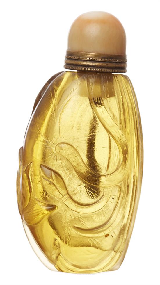 Lead glass flat bottle form, finely decorated with idyllic scenes, Qianlong mark to base, together with an amber glass bottle with lotus decoration, (2), tallest 8cm high.