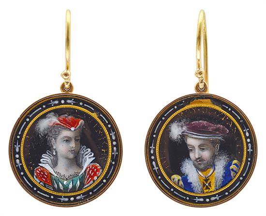 Comprising a pendant and earrings, each circular panel finely enamelled with a Shakespearian figure, mounted in 15ct gold, signed Larard Bros.