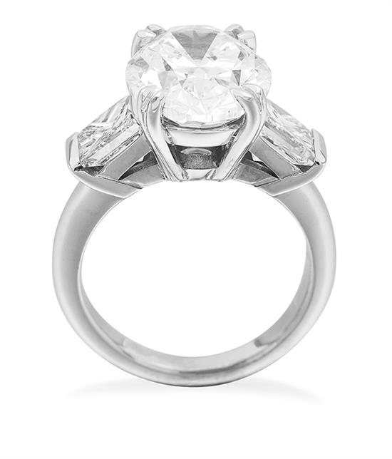 The oval cut diamond of 5.01cts, flanked by two princess cut diamonds totalling 1.40cts, mounted in 18ct white gold, ring size H-I, principal diamond accompanied by a GIA certificate stating colour G and clarity SI1.