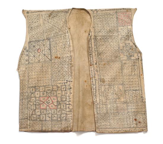 A BURMESE TRIBAL WITCHDOCTOR'S OUTFIT, jacket, square head cover and magic square placed in front of diviner.