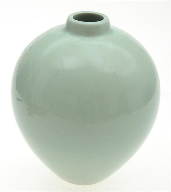 A COLLECTION OF CELADON GLAZED ITEMS, including small hibachi accompanied by bamboo tube, cherry blossom motif bowl and bulbous vase The bowl 19cm diameter