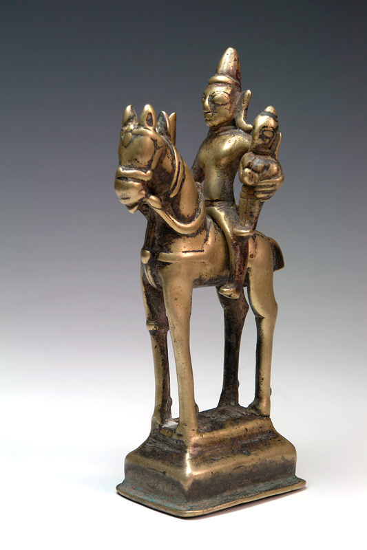 FOUR 18TH CENTURY CAST METAL FIGURES, including bronze Sarasvati, Vishnu, seated diety and horseman. The Vishnu is 12.5cm high