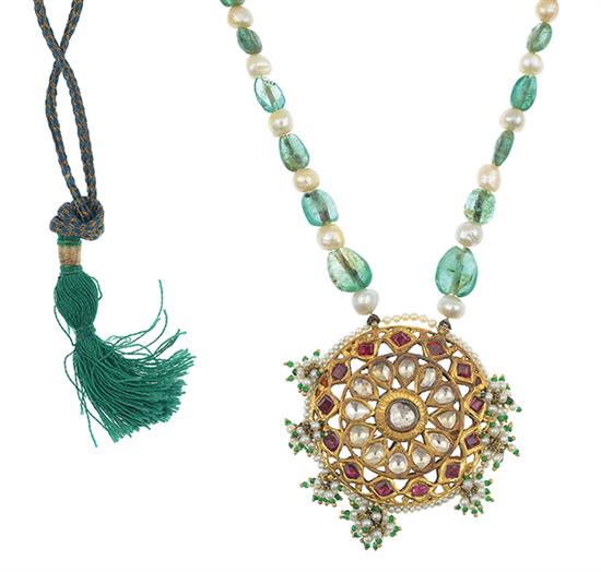 A 22CT GOLD PENDANT, set with diamonds and red beads, necklace of natural pearls and emeralds, enamelling to verso