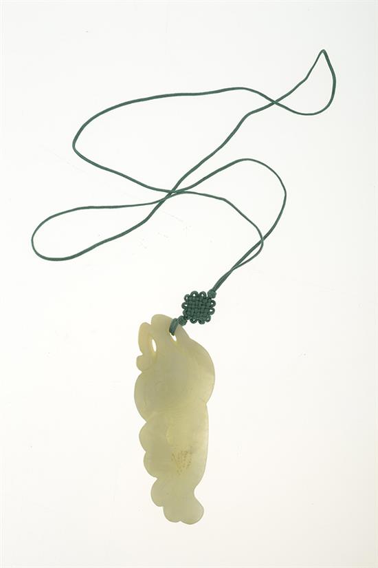 THREE JADEITE PENDANTS, including fish, chilong and two lotus flowers. The chilong 8.6cm long