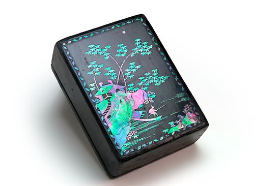 FOUR LACQUER WARE ITEMS, including tray, cinnabar style box, abalone shell inlaid plaque and inkstone box The tray 33cm diameter