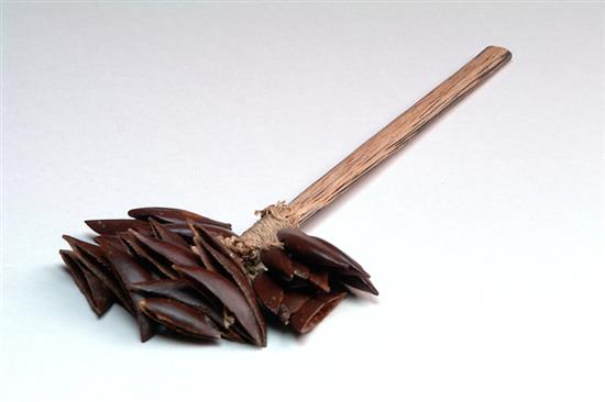 A COLLECTION OF TRIBAL OBJECTS, including a pair of Highlands armbands, Solomon islands dance rattle, witchdoctors amulet bag, wooden weaving implement, coconut ladle, Massim region betelnut mortar, child's bilum and status symbol pendant. The weaving implement 28cm long