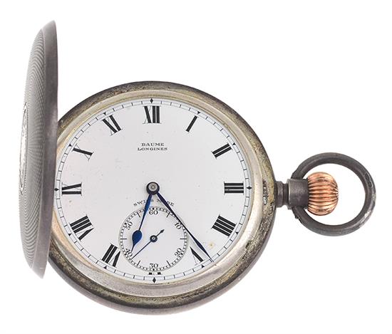 The Longines pocketwatch in sterling silver, with engine turned outer case, the inner case with presentation engraving to "Clarence Peterson de la Motte for his part in the mission to rescue the Ross sea survivors of Shackleton's ill-fated Trans Antarctic expedition". De la Motte was also awarded the Bronze Polar medal.