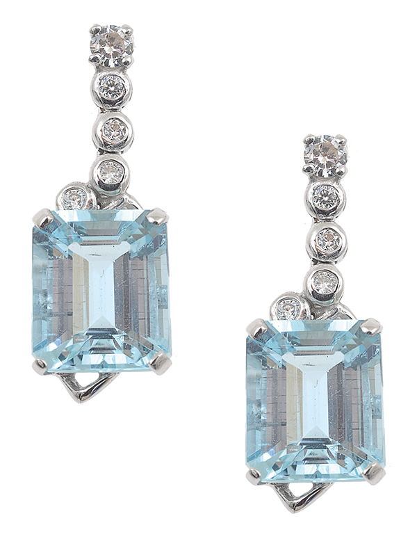 Each set with an emerald cut aquamarine of 4.15cts, surmounted by round brilliant cut diamonds, mounted in 18ct white gold.