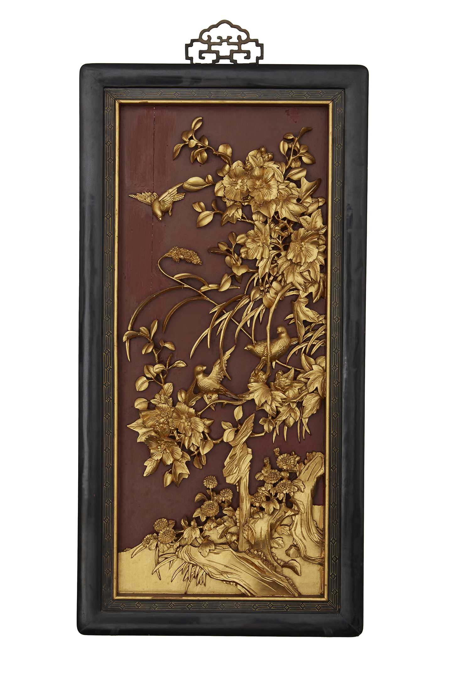Featuring gilt relief carving of flowers and birds. Each panel 45.5 x 92cms