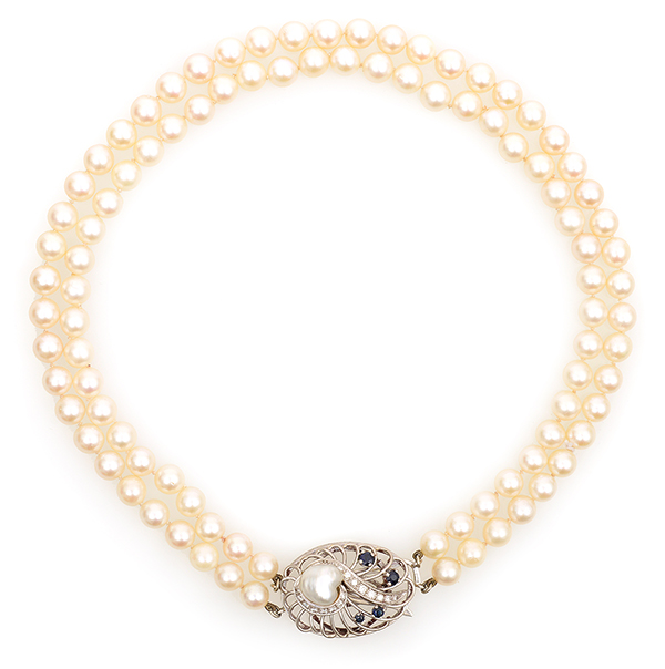 The round pearls of white and cream hues measuring 7.45-7.70mm, to an oval pierced clasp set with a keshi pearl, amongst round brilliant cut diamonds and sapphires, total length 440mm.