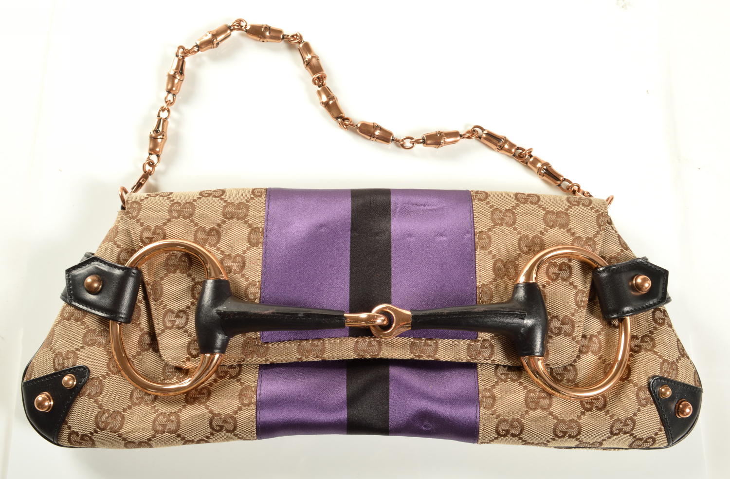 Styled in signature canvas, purple and black satin stripe, black leather trim and gold metal hardware, 37 x 15cm.