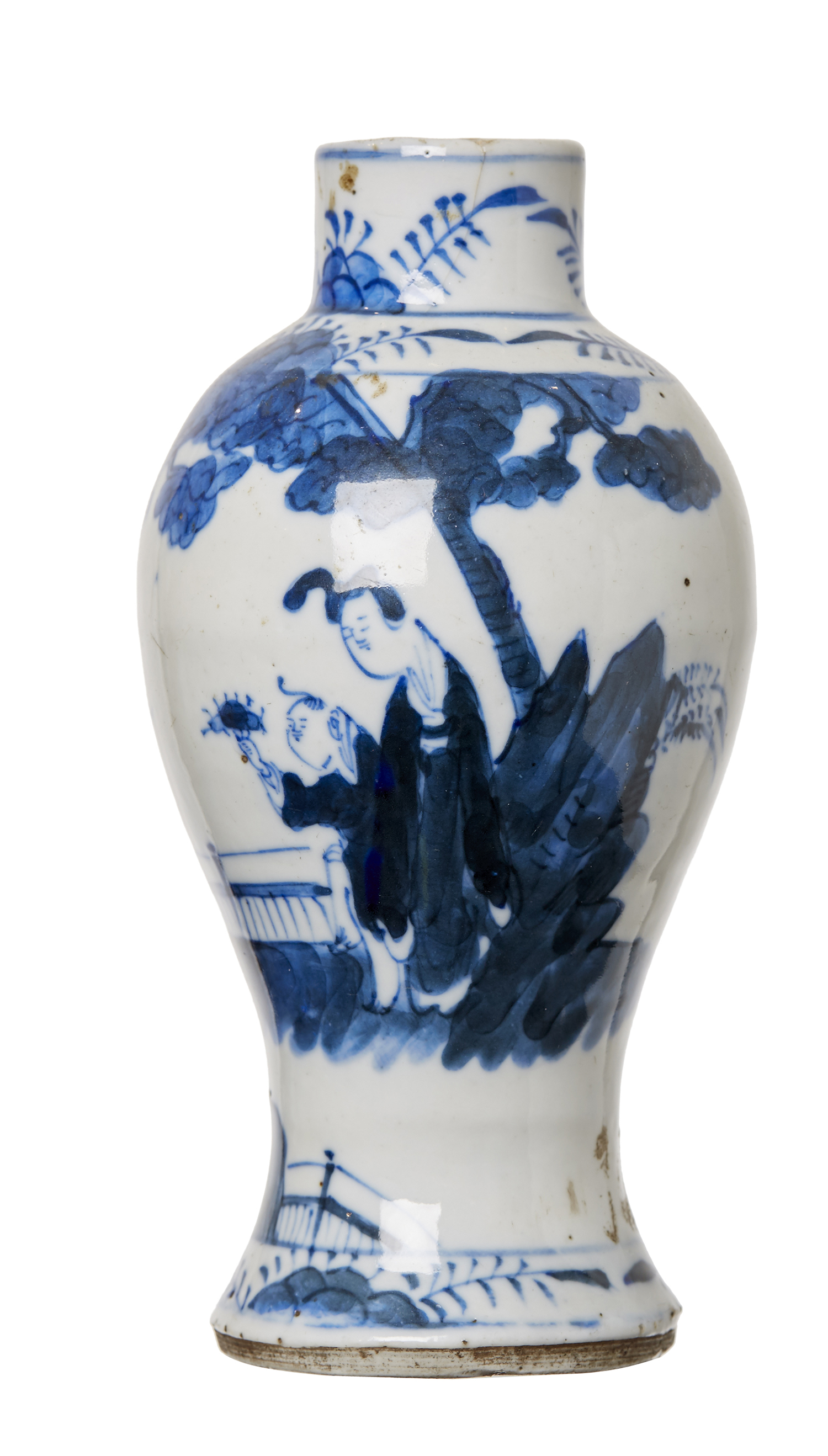 EARLY 19TH CENTURY TEA BOWL AND COVER TOGETHER WITH AN 18TH CENTURY FAN SHAPED DISH AND A 19TH CENTURY BALUSTER VASE