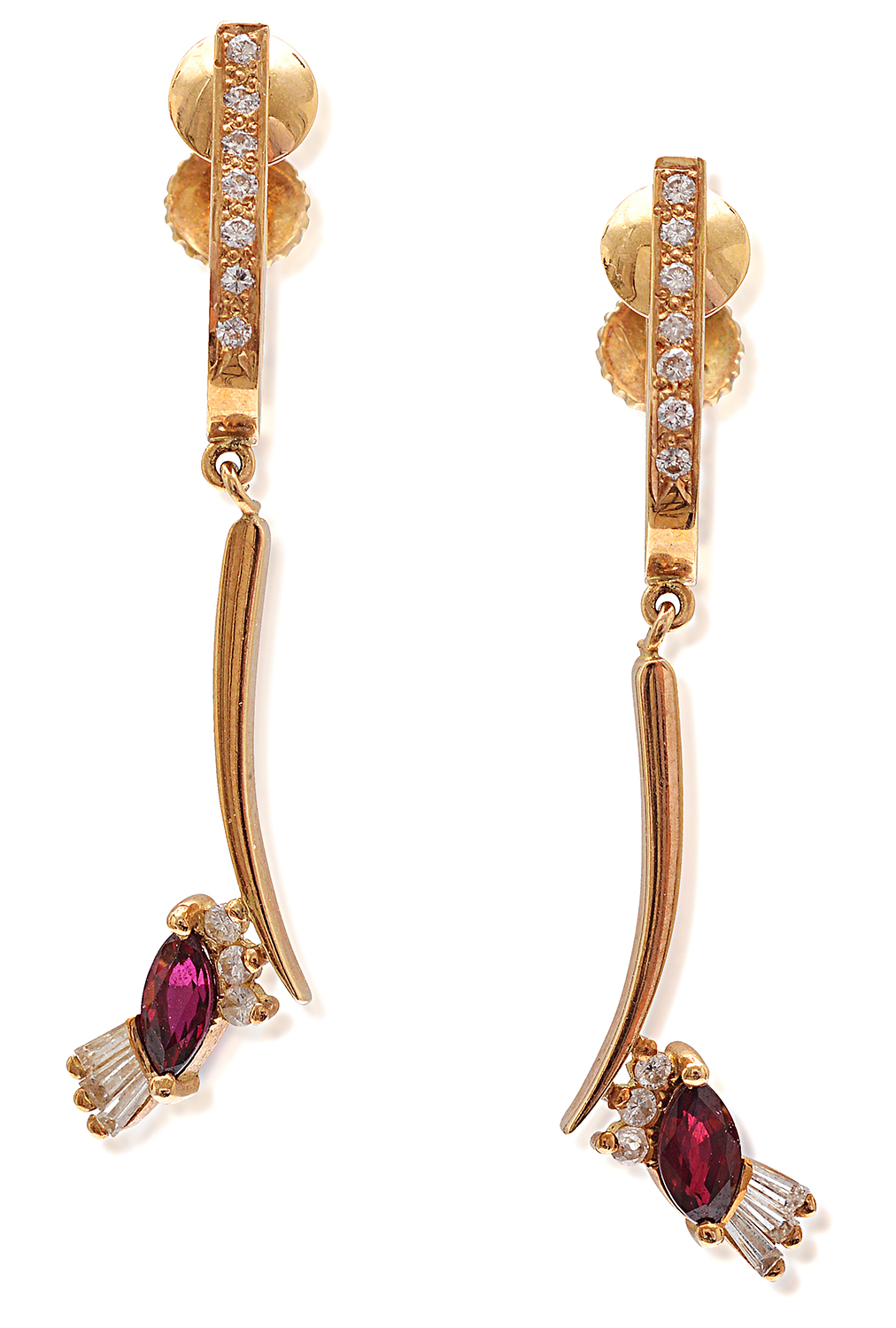 Comprising a ring and pair of earrings, the ring featuring a marquise cut ruby of 1.00cts, offset by a row of graduated tapered baguette and round brilliant cut diamonds, the earrings of conforming design, all mounted in 18ct gold, ring size M.
