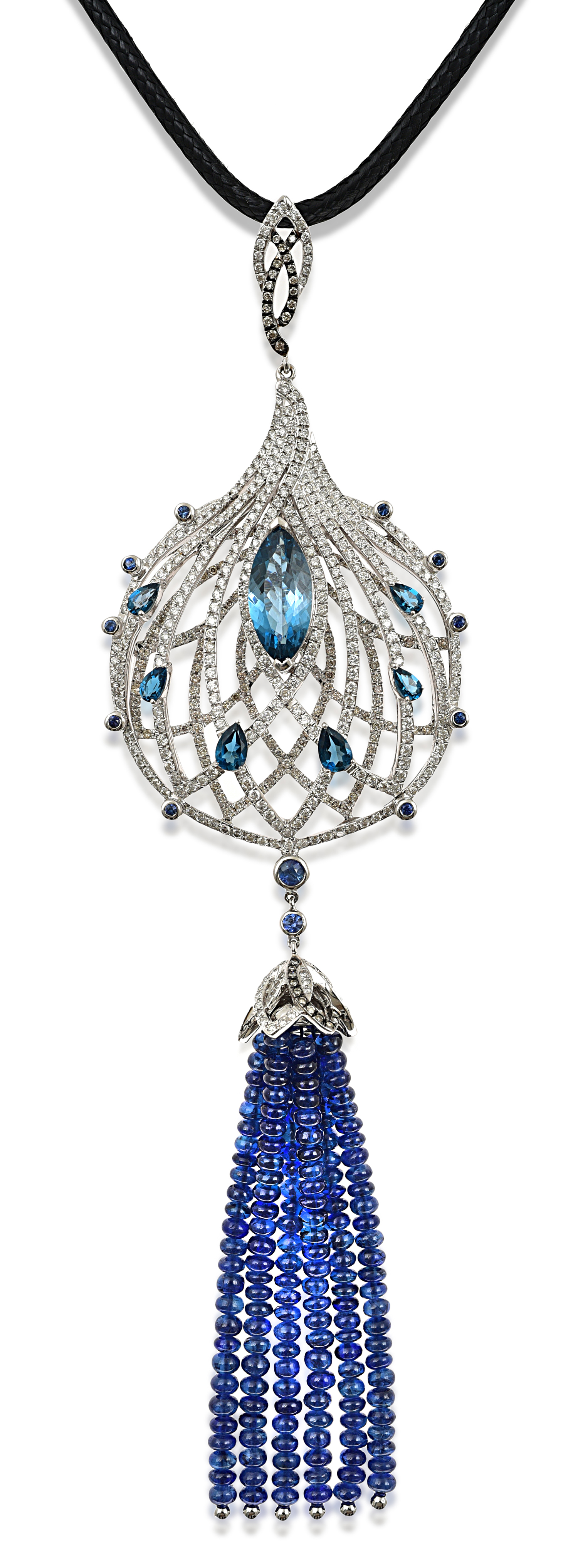 Featuring a pierced stylised tear drop panel centrally set with a marquise cut London blue topaz offset by six pear cut topaz, highlighted by grain set round brilliant cut diamonds and sapphires, suspended with a drop featuring a six strand tassel of sapphire beads, all mounted in 18ct white gold to a plaited leather necklace.