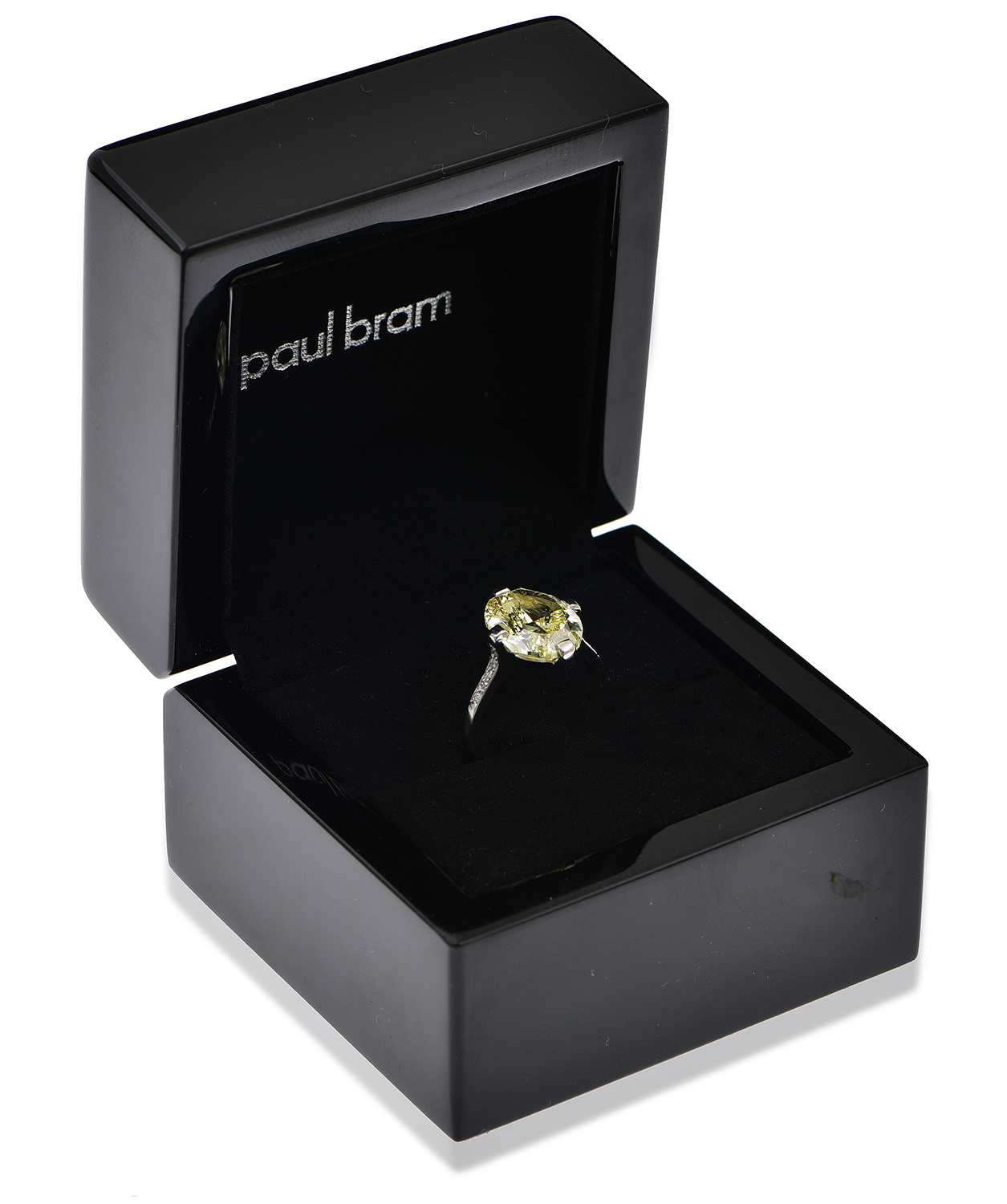 There are abrasions/chips to the girdle above on shoulder and below the GIA laser inscription, these do not appear on the original GIA certificate. The original GIA grades colour as natural fancy yellow, clarity SI1. Culet has been faceted as noted on GIA report. All diamonds secure in their settings. Inside of shank signed PB.