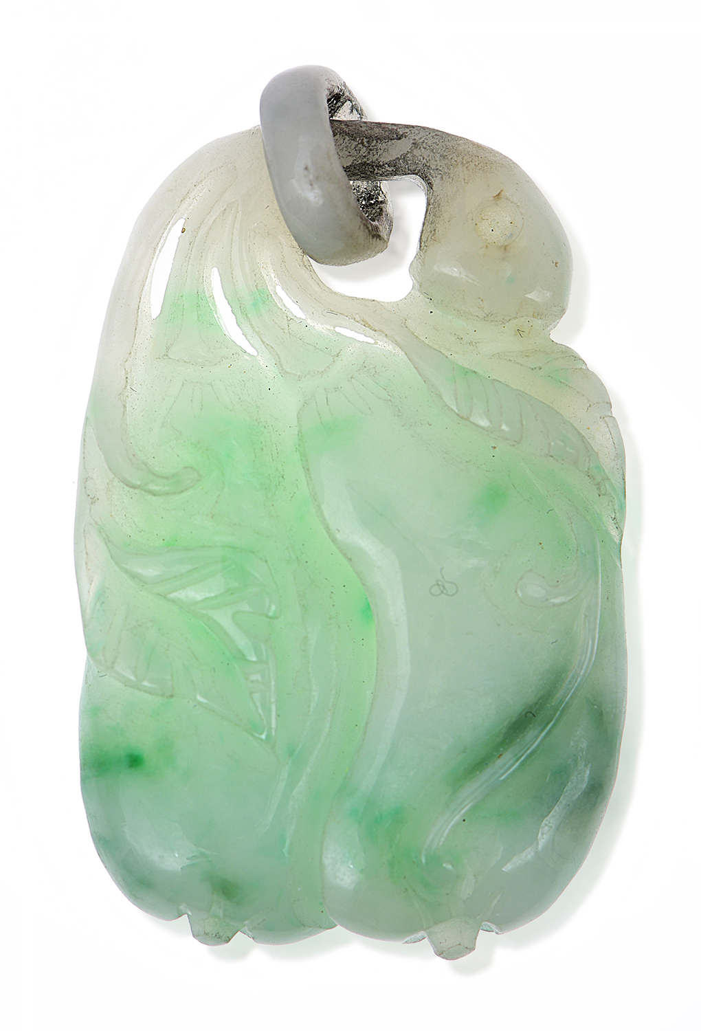 Carved from one solid piece of jadeite. Mottled green with white. This jade is uncertified and has not been confirmed by a laboratory. RI tested at 1.66.