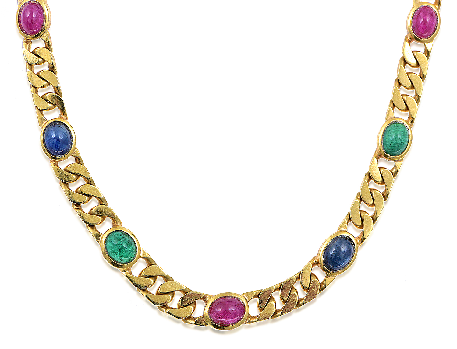 Comprising a necklace and pair of earrings, the flat curb link necklace interspaced with cabochon rubies, sapphires and emeralds, the earrings of conforming design with diamond detail, all mounted in 18ct gold.