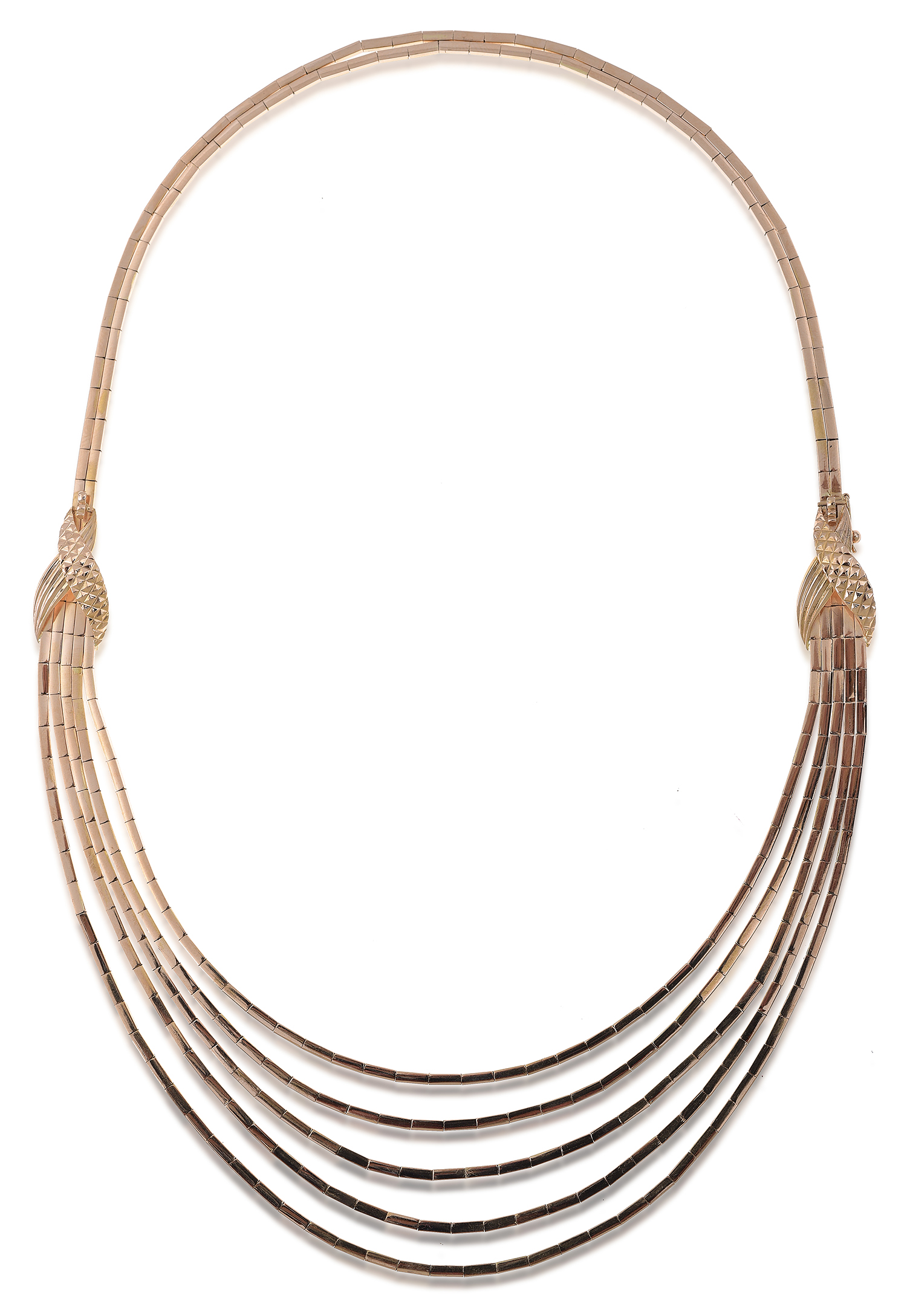 The multi strand suite overlaid with cross decoration, mounted in 18ct rose gold, total length 450mm and 180mm.
