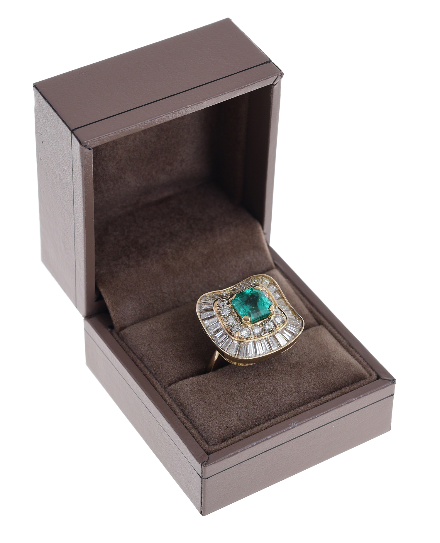 The ring featuring a cushion cut emerald of 2.08cts, surrounded by a row each of round brilliant and baguette cut diamonds totalling 2.45cts, mounted in 18ct gold, ring size M, together with a pair of earrings of conforming design mounted in 14ct gold.