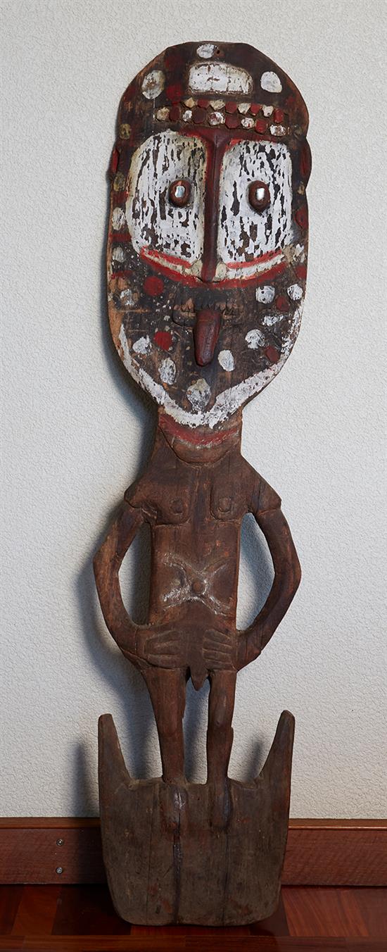 A CULT FIGURE, KARWARAI RIVER AREA, EAST SEPIK PROVINCE TOGETHER WITH A BASKET HOOK FIGURE, MIDDLE SEPIK RIVER, PAPUA NEW GUINEA