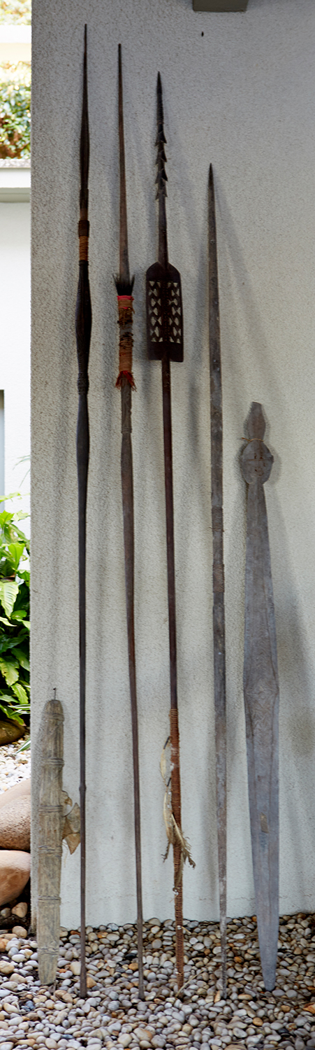 four spears: variously decorated with string and feathers, 268cm; 264cm; 257cm; 231cm (length)