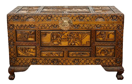TWO ORNATELY CARVED CHINESE EXPORT CAMPHOR CHEST CHESTS, CIRCA SECOND QUARTER OF THE 20TH CENTURY