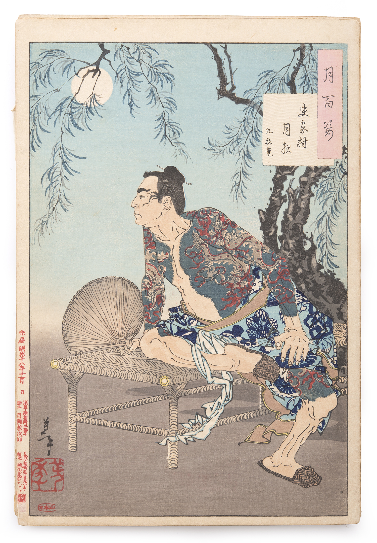 History: Yoshitoshi was considered the last great master of Ukiyo-e and the popular Tsuki hyakushi series - as it is called in Japanese - was published during the last seven years of his life between 1885-1892. The set consists of a hundred single sheets with very diverse subjects and only one common theme - the moon, which is visible on almost all prints.