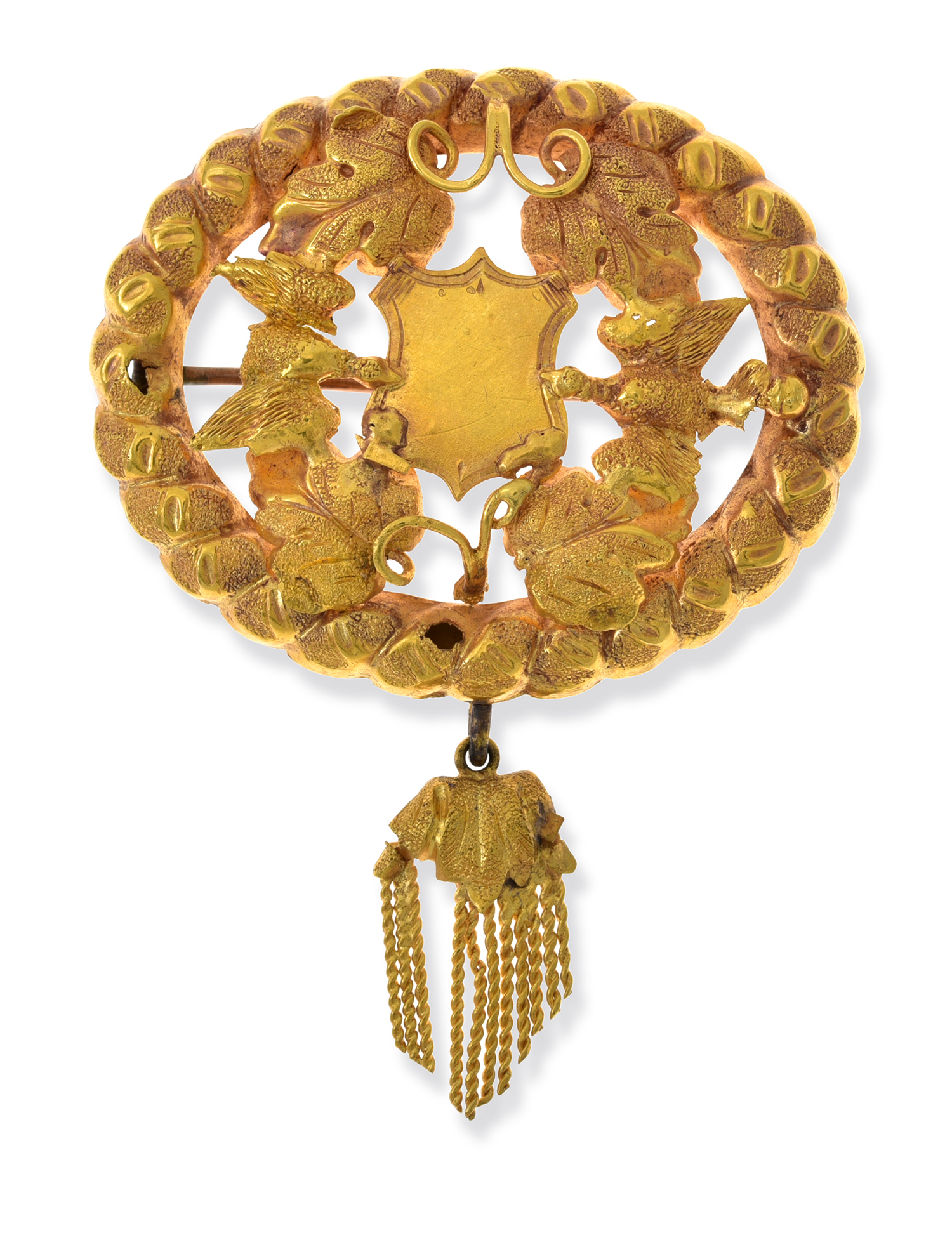 The brooch with leaf, tendril, bird and rope twist design, to a central medallion with fringe detail, the pendant earrings of conforming design, in 22ct gold, boxed.