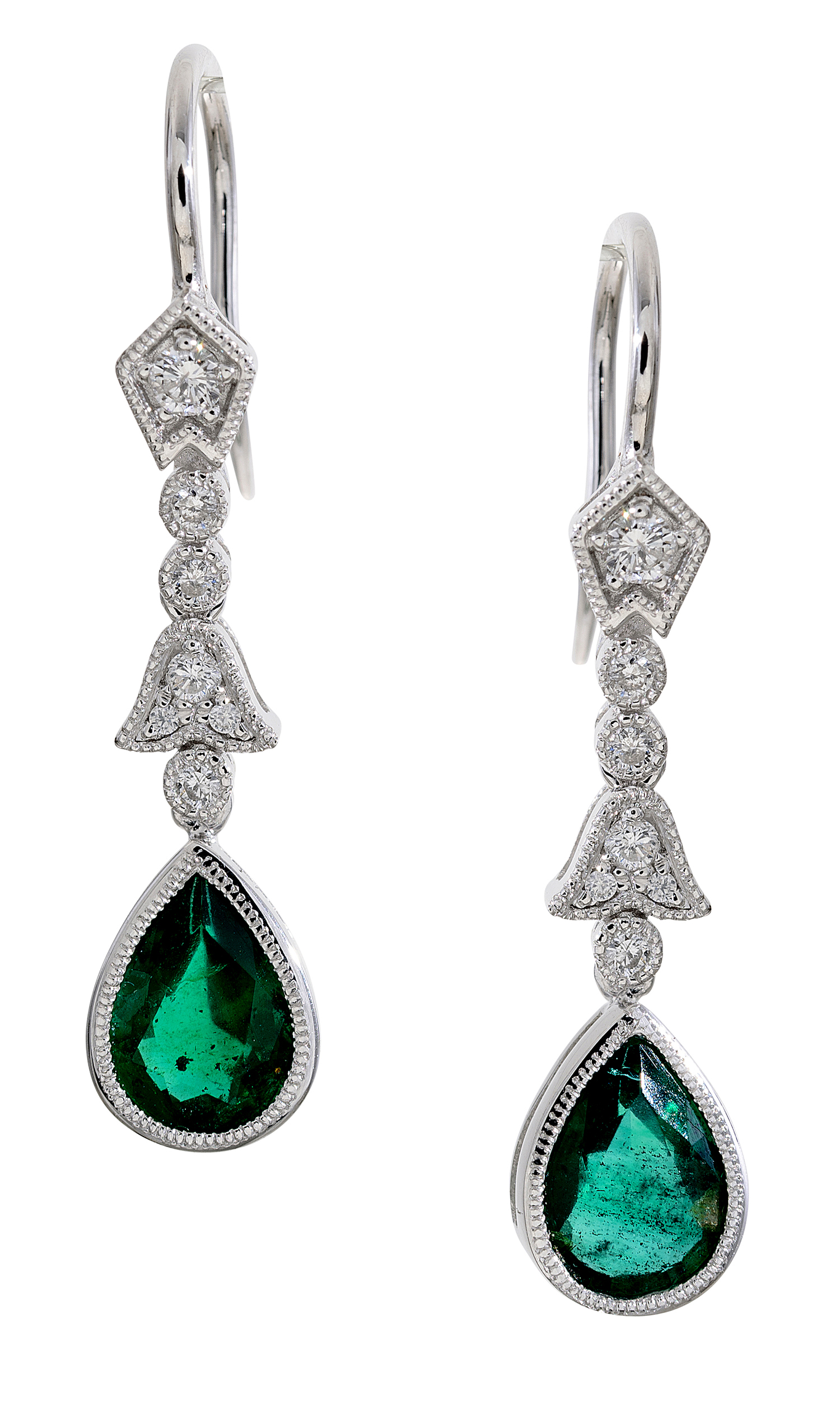 Comprising a necklace and earrings, the necklace comprising a double drop each set with a principal pear cut emerald and two marquise diamonds, with further emerald and round brilliant cut diamond detail, total length 480mm, the earrings of conforming design.