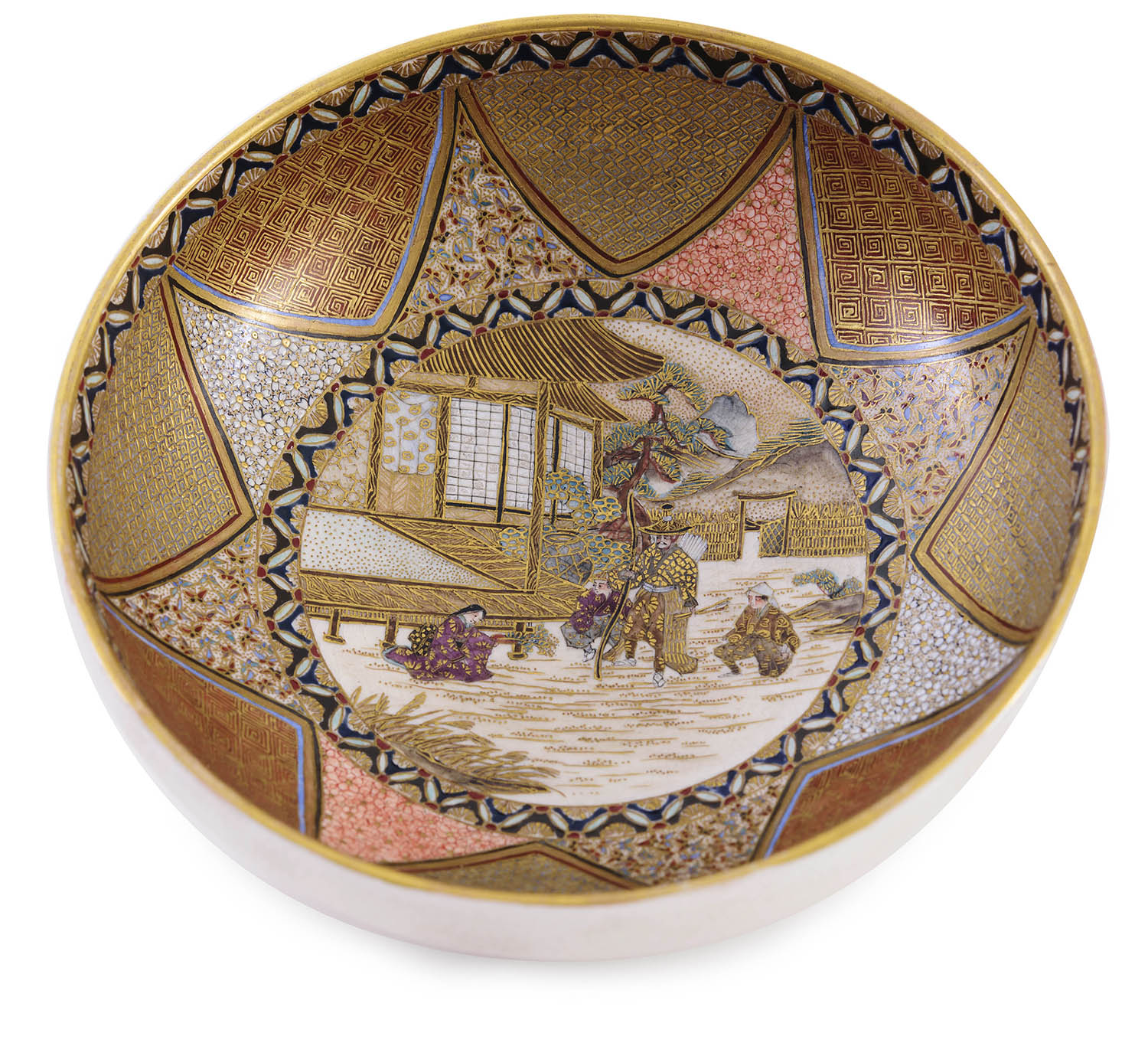 Comprising a dish, signed Kozan Sei, 15cm diameter, a small lidded box (no signature) and a satsuma bowl, signed to underside, 13cm diameter, 5cm high (3)