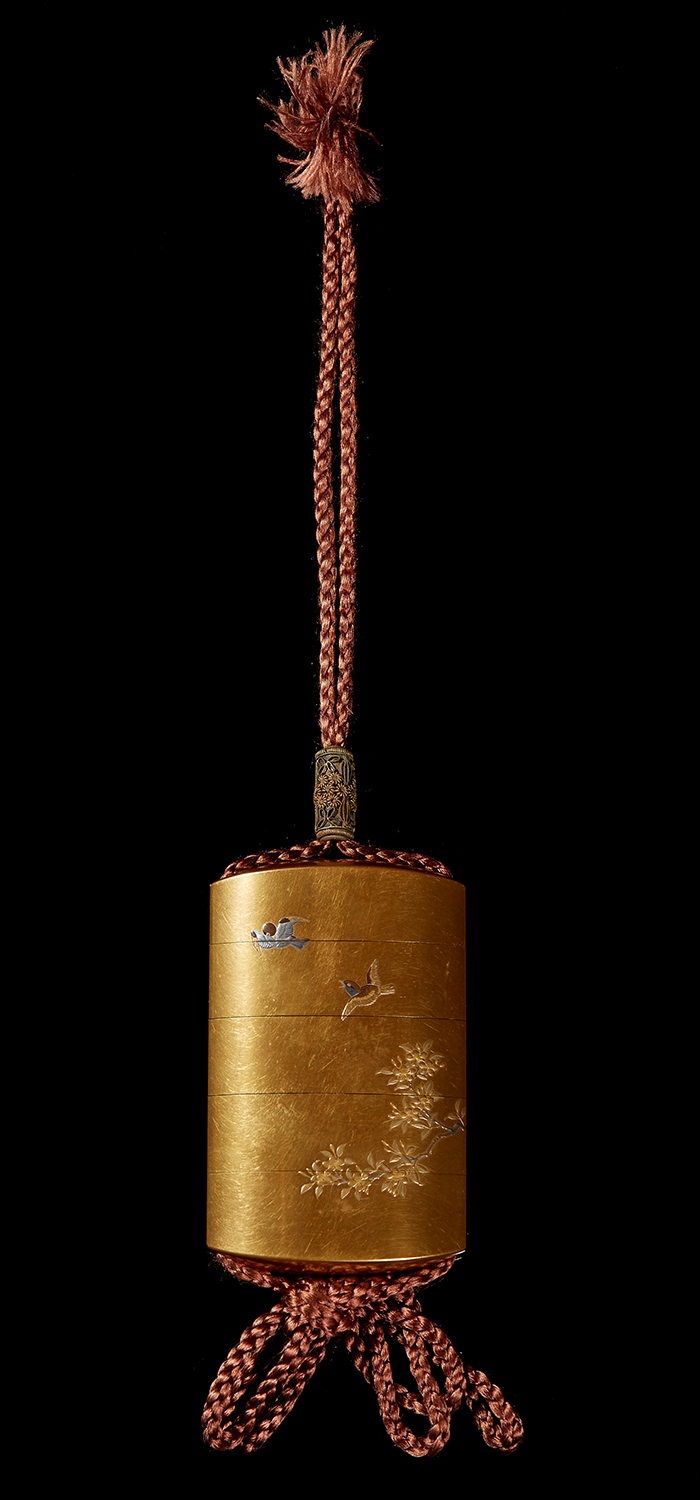Bearing a kinji ground and decorated with the rare motif of a long tailed bird of paradise on cherry blossom in takamakie and hiramakie, the reverse sparsely decorated with flying sparrows and blossom, the interior risers in nashiji, signed Hasegawa Shigeyoshi saku with red pot seal hashira, 8.5cm high