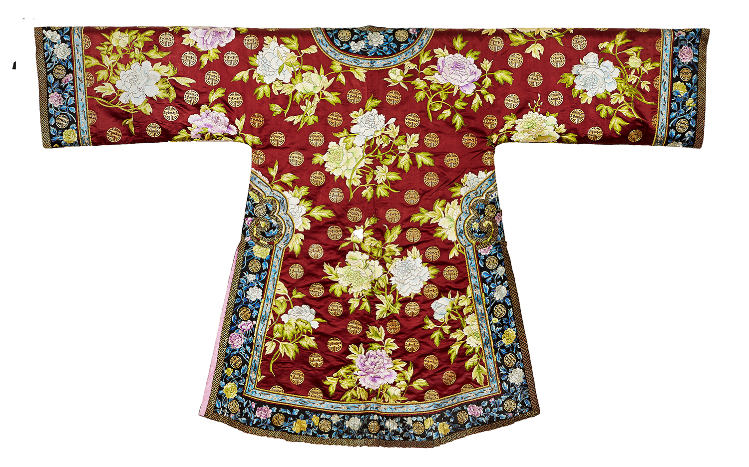 The very beautiful robe embroidered on a chestnut silk with peonies in green, lilac and ice blue, decorated with auspicious emblems for good fortune and longevity, and exquisitely edged with golden thread. A rare pleated hem, indicates an Imperial winter robe, presented in a perspex case measuring 227 width x 20 depth x 149cm height