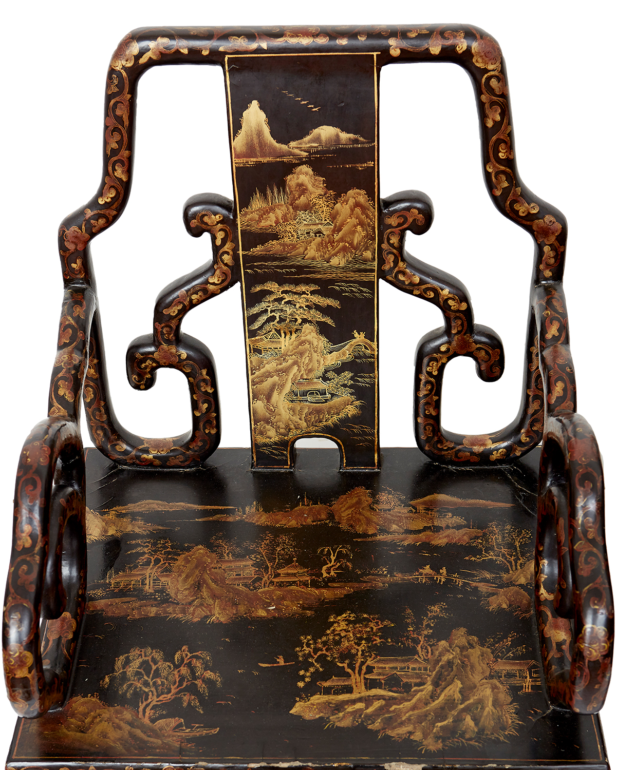 A FINE PAIR OF BLACK LACQUER AND GILT ARM CHAIRS