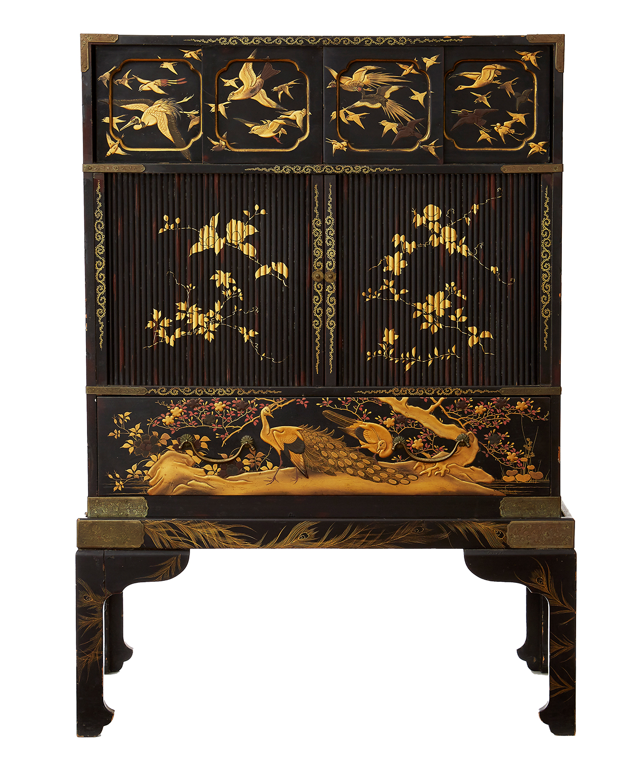 On a black ground, the main ribbed cabinet decorated in plum, the base with a short sliding drawer in hiramakie peacocks and the sliding doors in an assortment of birds, highlights in scrolling grasses and gilt brass kanagu fittings, unsigned, 63cm width x 33cm depth x 89cm height