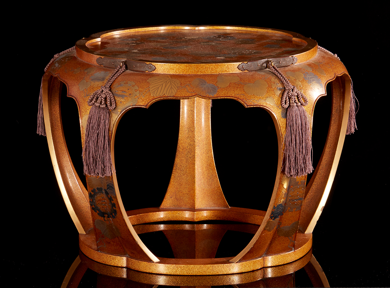 This piece was used as a stand for a water-bowl for the tea ceremony or other object that would have been placed on a padded silk cushion. With sumptuous use of gold and silver, tables of this kind are extremely rare and were only used by those of the highest nobility. A similar shaped stand is thought to reside in the collection of the Kyoto Imperial Palace where it forms part of a matching set of lacquer furniture, probably made as a wedding gift for a member of the imperial family.