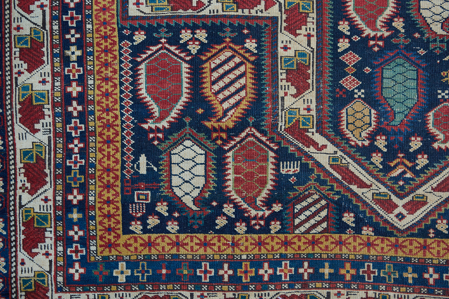 A fine example with repeated 'boteh' paisley motif on a blue ground, with spandrels above the 'Mihra' or prayer arch containing designs imitating combs and scissors, 150 length x 125cm width