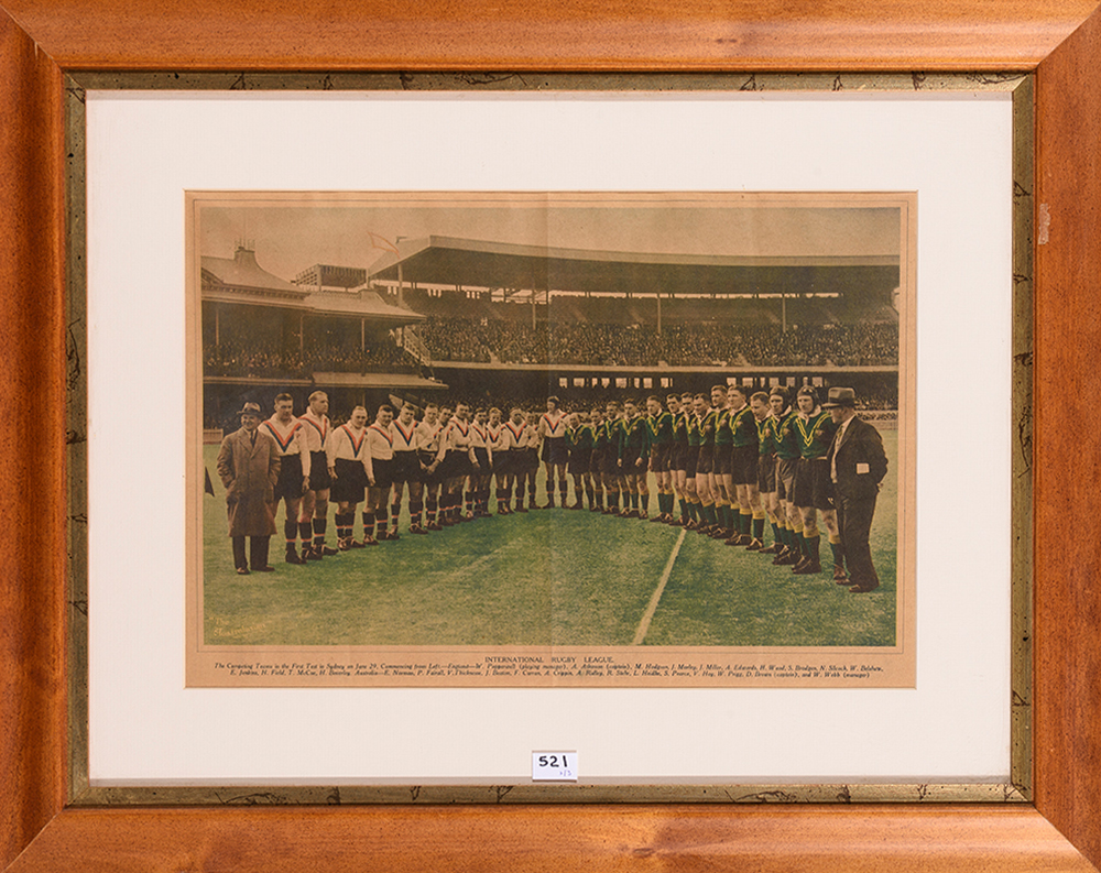 RAY STEHR GROUP: NEGATIVE OF 1936 AUSTRALIAN RL TEAM FOR FIRST TEST V ENGLAND: FRAMED NEWSPAPER CLIPPING; 1962 PHOTO OF RAY STEHR WITH NORM PROVAN AND ARTHUR SUMMONS. (On view only in Sydney, items to be collected from Sydney at purchasers expense).