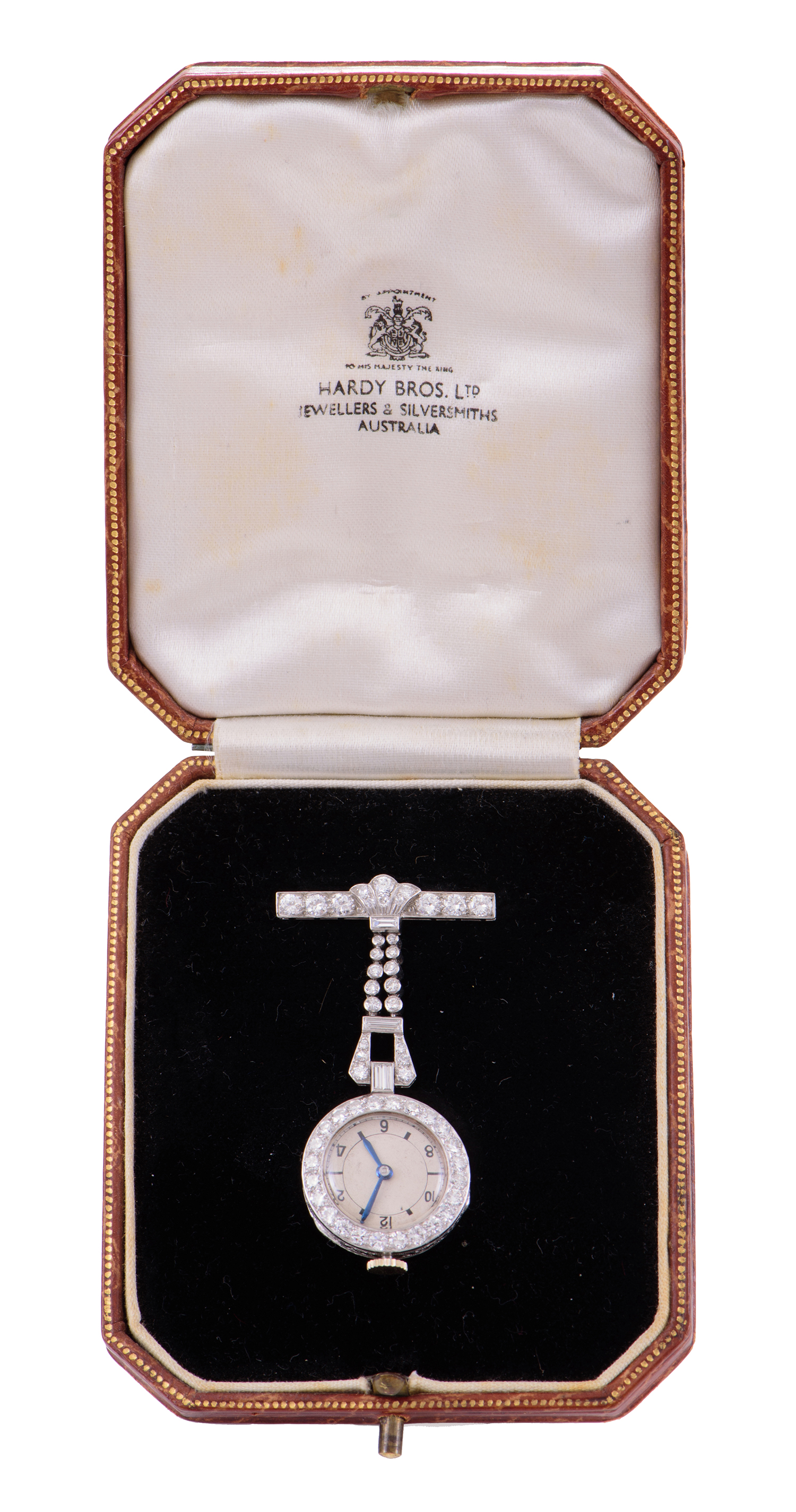 The diamond watch suspended from a diamond set brooch fitting with fleur-de-lys design, mounted in 18ct white gold, presented in original Hardy Brothers fitted box.