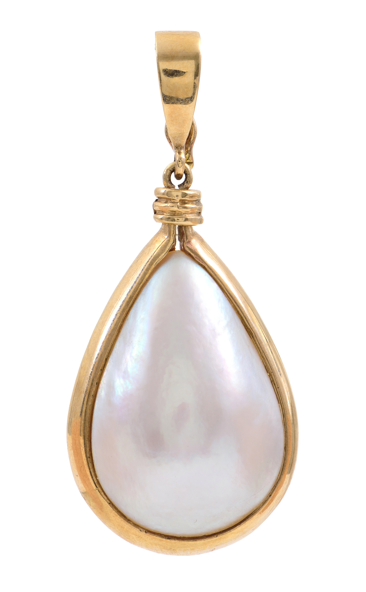 Comprising a pendant and a pair of earrings, the pear shaped mabe pearls, mounted in gold.