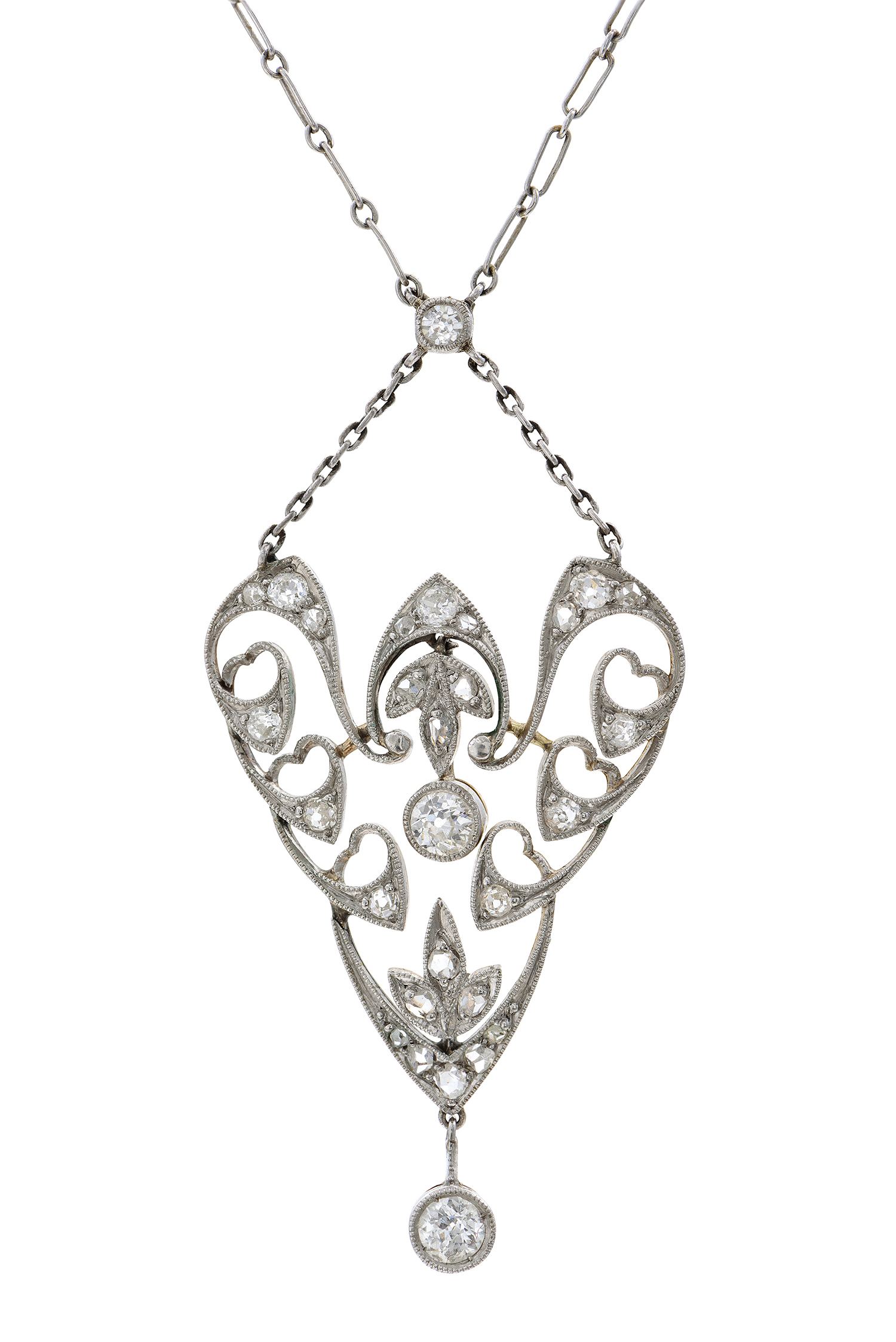 Of millegrain and openwork design, set throughout with old European and rose cut diamonds totalling 0.60cts, mounted in platinum and 15ct gold, total length 480mm, retailed by Vine & Thompson, 86 Aldersgate Street, London, with original fitted box.