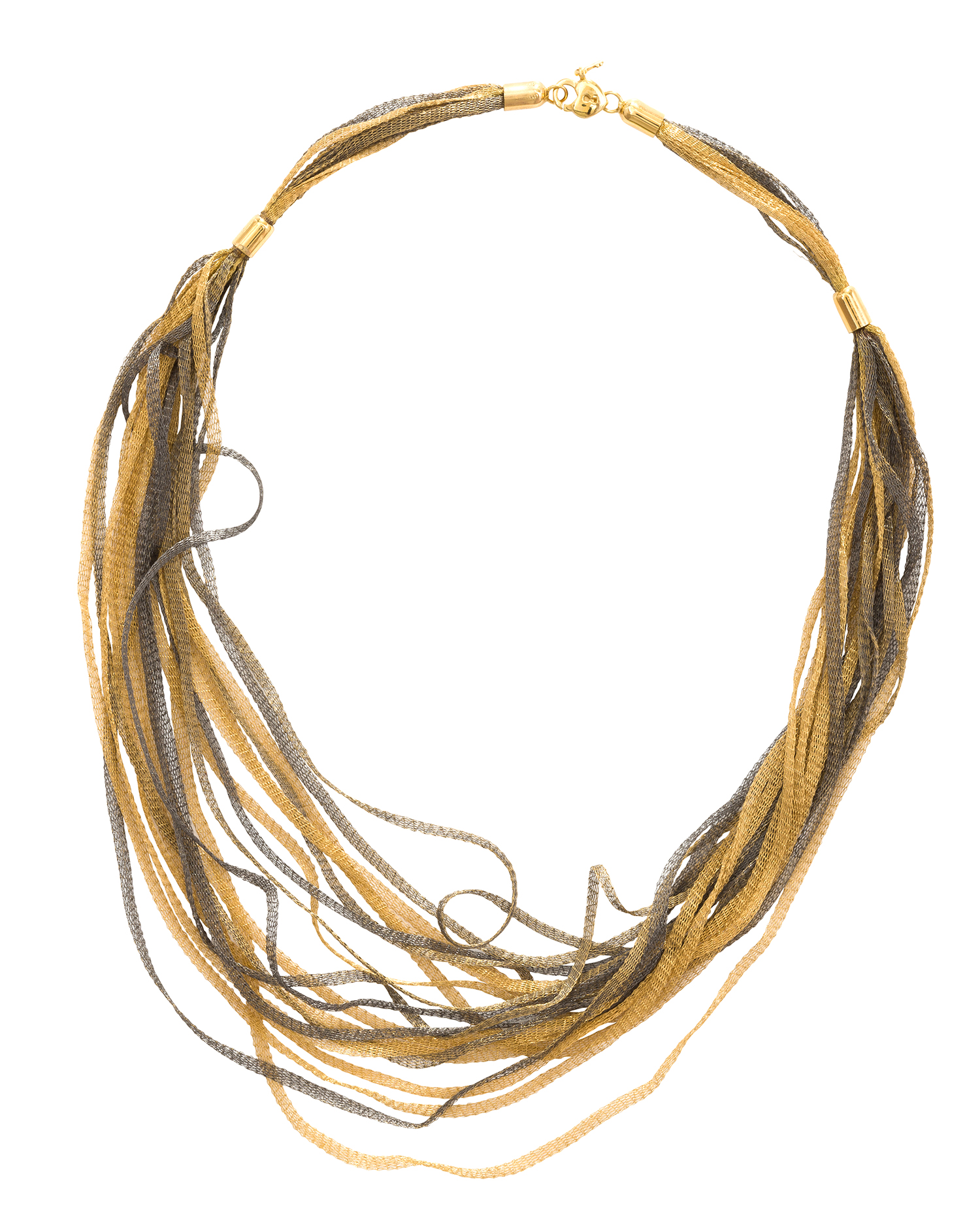 Comprising a necklace, bracelet and earrings, multi-strand gold mesh, mounted in 18ct gold.